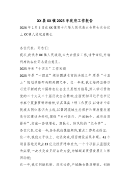XX县XX镇2025年政府工作报告2026年1月5日在XX镇第十六届人民代表大会第七次会议上XX镇人民政府镇长各位代表、同志们:现在,我代表XX镇人民政府,向大会报告工作,请予审议,并请列席的各位同志提出意见。2025年和“十四五”工作回顾2025年是“十四五”规划圆满收官的决胜之年,更是“十五五”规划谋篇布局的关键之年。这一年来,我们始终坚持以习近平新时代中国特色社会主义思想为指导,深入学习贯彻党的二十大及二十届历次全会精神,全面贯彻习近平总书记考察宁夏重要讲话精神,认真落实上级工作要求,以铸牢中华民族共同体意识为主线,以黄河流域生态保护和高质量发展先行区建设为牵引,围绕“乡村振兴、产城融合、城市品质提升”,打出一套稳增长、惠民生、防风险的“组合拳”。各位代表,过去一年,各条战线捷报频传,...