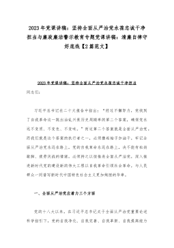 2023年党课讲稿:坚持全面从严治党永葆忠诚干净担当与廉政廉洁警示教育专题党课讲稿:清廉自律守好底线【2篇范文】