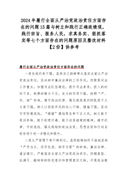 2024年履行全面从严治党政治责任方面存在的问题15篇与树立和践行正确政绩观,践行宗旨、服务人民,求真务实、狠抓落实等七个方面存在的问题原因及整改材料【2份】供参考