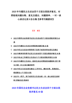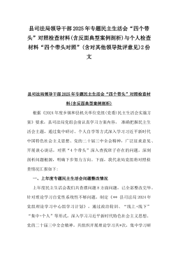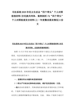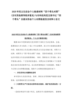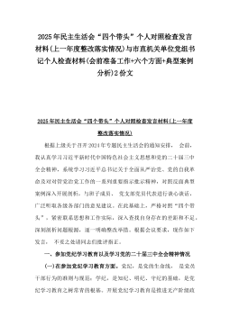 2025年民主生活会“四个带头”个人对照检查发言材料(上一年度整改落实情况)与市直机关单位党组书记个人检查材料(会前准备工作+六个方面+典型案例分析)2份文2025年民主生活会“四个带头”个人对照检查发言材料(上一年度整改落实情况)根据上级关于召开2024年专题民主生活会的通知安排,会前,我认真学习习近平新时代中国特色社会主义思想和党的二十届三中全会精神,系统学习习近平总书记关于全面从严治党、党的自我革命及对对管党治党工作的一系列重要指示批示精神,对照反面典型案例深入开展剖析,与班子成员、党支部党员代表进行谈心谈话,广泛听取各级各部门的意见建议。在此基础上,严格对照“四个带头”,紧密联系思想和...