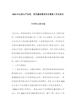 2024年全面从严治党、党风廉政建设和反腐败工作总结及下半年工作计划今年以来,局党委坚持以习近平新时代中国特色社会主义思想为指导,全面贯彻落实党的XX大和二十届二中全会精神,深入落实习近平总书记关于党的建设重要思想,认真贯彻落实市委、市纪委有关开展党风廉政建设部署和要求,坚持以党纪学习教育为抓手,坚持全面从严治党,狠抓党风廉政建设责任制落实,坚定不移正风肃纪,筑牢拒腐防变的思想防线和制度防线,为全市营造风清气正的政治生态和干事创业的强劲动能,以高质量党建引领高质量发展行稳致远。现将工作开展情况总结如下:一、工作开展情况(一)提升政治站位,加强政治建设。局党委始终做到把党的政治建设摆在首位,认真...