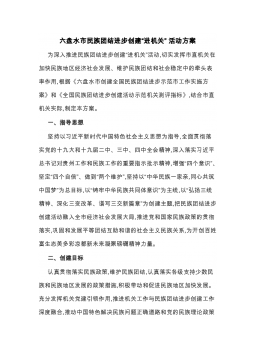 六盘水市民族团结进步创建“进机关”活动方案为深入推进民族团结进步创建“进机关”活动,切实发挥市直机关在加快民族地区经济社会发展、维护民族团结和社会稳定中的牵头表率作用,根据《六盘水市创建全国民族团结进步示范市工作实施方案》和《全国民族团结进步创建活动示范机关测评指标》,结合市直机关实际,制定本方案。一、指导思想坚持以习近平新时代中国特色社会主义思想为指导,全面贯彻落实党的十九大和十九届二中、三中、四中全会精神,深入落实习近平总书记对贵州工作和民族工作的重要指示批示精神,增强“四个意识”、坚定“四个自信”、做到“两个维护”,坚持以“中华民族一家亲,同心共筑中国梦”为总目标,以“铸牢中华民族共同体...