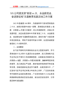 公文搜——海量公文资料,关注立即下载www.gwsoso.comXX公司团支部“喜迎xx大、永远跟党走、奋进新征程”主题教育实践活动工作方案2022年是建团100周年,为迎接和学习宣传贯彻党的二十大,按照共青团中央统一部臀,贯彻落实共青团xx省委、共青团xx市委工作要求,经公司团委研究,并报公司党委同意,决定在团员青年中开展“喜迎二十大、永远跟党走、奋进新征程”主题教育实践活动,团结引领广大团员青年坚定跟党走、用实干实绩书写奋斗华章,以优异成绩迎接党的二十大胜利召开。一、总体要求以习近平新时代中国特色社会主义思想为指导,学习贯彻党的十九大和十九届历次全会精神,深入贯彻制习近平总书记关于青年工作...