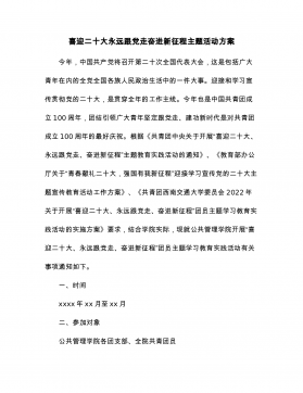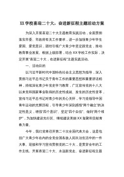 XX学校喜迎二十大,奋进新征程主题活动方案为深入开展喜迎二十大主题教育实践活动,全面贯彻落实市委、市政府有关工作要求,进一步加强青少年学生爱国、爱党意识,团结引领广大青少年坚定跟党走,推动教育事业发展。根据上级部署,结合XX学校工作实际,决定开展“喜迎二十大,在进新征程”主题实践活动。一、活动目的以习近平新时代中国特色社会主义思想为指导,深入贯彻习近平总书记关于青年工作的重要思想和重要讲话精神,持续深化青少年党史学习教育,广泛宣传党的十八大以来党和国家事业取得的历史性成就、发生的历史性变革,宣传习近平总书记对青少年的关心关怀,学习党领导中国青年运动的光辉历程,引导青少年深刻感悟“两个确立”的决...