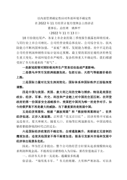 以内部管理确定性应对外部环境不确定性在2022年11月经营计划月度例会上的讲话董事长、总经理姚和平(2022年11月13日)10月份接近尾声,各家上市企业的第三季度报告披露也即将结束。与同行业上市公司相比,公司经营业绩总体良好,公司综合实力、抗风险能力不断巩固和加强,“家底”增厚,发展能力增强。美中不足的是公司经营利润和销售目标计划未达预期,最主要的原因宏观经济形势发生重大变化,外部环境存在严峻性、复杂性和重大不确定性,我们都感受到了冬天传递来的“寒气”。一是新冠疫情对国际格局和生产贸易活动造成严重影响;二是俄乌冲突引发欧洲能源危机,包括石油、天然气等能源价格的上涨;三是国际力量对比发生深刻变...