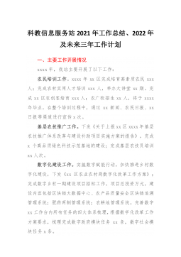 科教信息服务站2021年工作总结、2022年及未来三年工作计划一、主要工作开展情况xxxx年,我站主要开展了以下工作:农民培训工作。xxxx年xx区完成培育高素质农民xxx人;完成农村实用人才培训xxx人,举办大讲堂xx期。完成xx区农创客培育xxx人;农广校招生xx人,将于xxxx年毕业。在整个培训过程中,通过xx新闻、农民日报、xx日报等渠道进行宣传x次。基层农技推广工作。下发《关于上报xx区xxxx年基层农技推广体系改革与建设补助项目实施方案的报告》,完成x个高品质绿色科技示范基地的建设;完成基层农技员培训xx人次。数字化建设工作。实施数字赋能行动,加快推进乡村数字化建设,下发《xx区农...