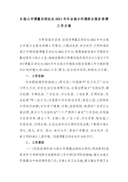 五指山市博鳌亚洲论坛2021年年会城乡环境综合服务保障工作方案为贯彻落实省委、省政府博鳌亚洲论坛2021年年会城乡环境卫生服务保障工作要求,以整洁优美、安全有序、文明和谐的城乡环境迎接博鳌亚洲论坛2021年年会,根据海南省城乡环境综合整治领导小组办公室、海南省精神文明建设指导委员会办公室关于印发《博鳌亚洲论坛2021年年会城乡环境综合服务保障工作方案的通知》(琼环整办函〔2021〕3号)要求,结合我市实际,特制定本方案。一、工作目标在加强疫情防控基础上,通过深入实施城市“创卫巩卫”、社会文明大行动、农村生活垃圾清理行动,全面治理城乡“垃圾乱扔、摊点乱摆、车辆乱放、广告乱设、污水乱排、工地乱象、...