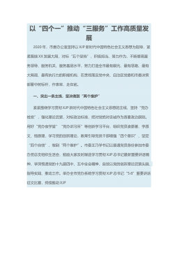 以“四个一”推动“三服务”工作高质量发展2020年,市委办公室坚持以XJP新时代中国特色社会主义思想为指导,紧紧围绕XX发展大局,对标“五个坚持”,积极担当、努力作为,不断提高服务领导、服务机关、服务基层水平,努力打造全市最有眼光、最有思路、最有大局观、最有执行力的职能机构,在贯彻落实党中央、自治区党委和市委决策部署中树标杆、作表率、走在前。一、突出一条主线,坚决做到“两个维护”紧紧围绕学习贯彻XJP新时代中国特色社会主义思想的主线,坚持“党办姓党”,强化理论武装,对标政治标准,把对党绝对忠诚作为首要政治原则。用好“党办夜学堂”“党办讲习所”等创新学习平台,组织党员读原著、学原文、悟原理,学习...