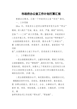市政府办公室工作计划打算汇报根据会议要求,汇报一下市政府办公室“四定”情况。一、工作思路20xx年,市政府办公室将全面贯彻市党代会和“两会”精神,深入践行“忠诚、敢当、务实、严谨、高效”的作风,坚持“一二三四”的工作思路,即:围绕市委、市政府的中心任务开展工作,牢牢树立实事求是、依法行政“两种意识”,全面提高服务经济、服务发展、服务全局“三种能力”,重点强化综合协调、参谋助手、政务服务、督查落实“四项职能",全面提高办公室工作水平,促进政府工作高效运行。二、工作重点及目标一是全面提高统筹水平。注重科学统筹,理清工作思路,分清轻重缓急,学会“弹钢琴”,做到忙而不慌,急而不乱,张弛有度,规范有序。...