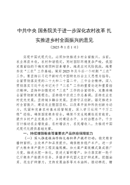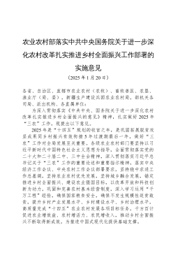 农业农村部落实中共中央国务院关于进一步深化农村改革扎实推进乡村全面振兴工作部署的实施意见(2025年1月20日)各省、自治区、直辖市农业农村(农牧)、畜牧兽医、农垦、渔业厅(局、委),新疆生产建设兵团农业农村局,部机关各司局、派出机构、各直属单位:为深入贯彻落实《中共中央、国务院关于进一步深化农村改革扎实推进乡村全面振兴的意见》精神,扎实做好2025年“三农”工作,现提出以下意见。2025年是“十四五”规划的收官之年,是巩固拓展脱贫攻坚成果同乡村振兴有效衔接5年过渡期最后一年,做好“三农”工作对全局发展至关重要。各级农业农村部门要坚持以习近平新时代中国特色社会主义思想为指导,全面贯彻落实党的二...