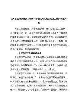 XX县医疗保障局关于进一步加强网络意识形态工作的实施方案为深入学习贯彻习近平总书记关于抓好意识形态工作的一系列重要论述,进一步加强和改进医疗保障局机关及下属单位的网络意识形态工作,落实党管意识形态原则,牢牢掌握网络意识形态工作的领导权主动权,明确党组领导班子、领导干部的网络意识形态工作责任,根据县委网络意识形态工作责任制,结合我局实际,制定本实施方案。一、意识形态工作目标和任务意识形态工作目标:巩固马克思主义中国化的系列理论成果在意识形态领域的指导地位;巩固人民群众团结奋斗的共同思想基础;自觉认同并践行社会主义核心价值观;在事关大是大非和政治原则问题上,掌握主动权、打好主动仗。意识形态工作任务...