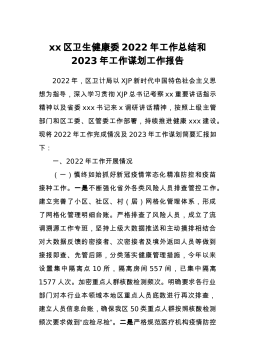 xx区卫生健康委2022年工作总结和2023年工作谋划工作报告2022年,区卫计局以XJP新时代中国特色社会主义思想为指导,深入学习贯彻XJP总书记考察xx重要讲话指示精神以及省委xxx书记来x调研讲话精神,按照上级主管部门和区工委、区管委工作部署,持续推进健康xxx建设。现将2022年工作完成情况及2023年工作谋划简要汇报如下:一、2022年工作开展情况(一)慎终如始抓好新冠疫情常态化精准防控和疫苗接种工作。一是不断强化省外各类风险人员排查管控工作。建立完善了小区、社区、村(居)网格化管理体系,形成了网格化管理明细台账。严格排查了风险人员,成立了流调溯源工作专班,坚持上级大数据推送和主动摸...
