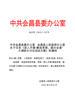 中共会昌县委办公室会办字〔2021〕63号中共会昌县委办公室会昌县人民政府办公室关于印发《深入开展“解放思想、振兴会昌”大调研大讨论活动方案》的通知各乡(镇)党委、人民政府,县委各部门,县直(驻县)各单位:经县委、县政府研究同意,现将《深入开展“解放思想、振兴会昌”大调研大讨论活动方案》印发给你们,请认真抓好贯彻落实。会昌县人民政府办公室2021年8月8日深入开展“解放思想、振兴会昌”大调研大讨论活动方案为深入贯彻落实党史学习教育“学党史、悟思想、办实事、开新局”总体要求,客观总结“十三五”以来会昌县经济社会发展的成效和经验,厘清现阶段会昌县情,深度剖析存在的突出问题和短板弱项,进一步解放思想...