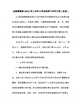 应急管理局2022年上半年工作总结和下半年计划(区县)xx县应急管理局坚持以习近平新时代中国特色社会主义思想为指导,坚持人民至上、生命至上理念,认真贯彻落实国家、省、市、县有关会议精神和决策部署,不断健全完善安全生产治理体系,夯实应急管理工作基础,加强新形势下应急能力建设,全力抓好自然灾害防治工作,提升防灾减灾救灾能力,推动全县应急管理体系和能力现代化建设。2022年x-x月,xx县各类生产经营性事故xx起,死亡x人,受伤xx人,直接经济损失x.xx万元,同比分别下降xx.xx%,上升xx%,下降xx.xx%,下降xx.xx。没有发生较大及以上事故。全县没有发生重大灾情,自然灾害防治渐显成效。...