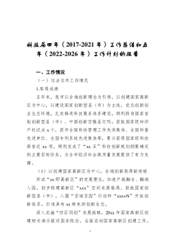 ·1科技局四年(2017-2021年)工作总结和五年(2022-2026年)工作计划的报告一、工作情况(一)过去五年工作情况1.取得成绩五年来,我市以全域创新理念为引领,以创建国家高新区为中心,以建设国家创新型县(市)为主线,优化创新创业生态环境,扎实推进科技服务体系建设,顺利跻身国家首批创新型县(市)、中国创新百强县行列,获批国家级知识产权试点x个,获评全国科技管理工作先进集体、全国科普先进单位、全国专利系统先进集体等,累计获得国家级科技荣誉近xx项,顺利完成了“xx五”科技创新规划纲要确定的主要目标任务,为全市经济社会高质量发展提供了有力支撑。(1)以创建国家高新区为中心,全域创新取得新突...