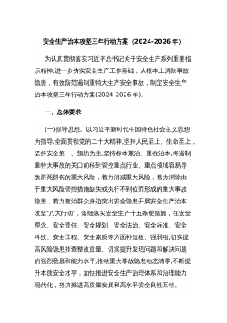 安全生产治本攻坚三年行动方案(2024-2026年)为认真贯彻落实习近平总书记关于安全生产系列重要指示精神,进一步夯实安全生产工作基础,从根本上消除事故隐患,有效防范遏制重特大生产安全事故,制定安全生产治本攻坚三年行动方案(2024-2026年)。一、总体要求(一)指导思想。以习近平新时代中国特色社会主义思想为指导,全面贯彻党的二十大精神,坚持人民至上、生命至上,坚持安全第一、预防为主,坚持标本兼治、重在治本,将遏制重特大事故的关口前移到管控重点行业、重点领域容易导致群死群伤的重大风险,着力消减重大风险,着力消除由于重大风险管控措施缺失或执行不到位而形成的重大事故隐患,着力整治群众身边突出安全...