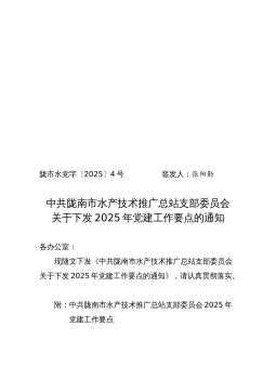 陇市水党字〔2025〕4号签发人:张阳勤中共陇南市水产技术推广总站支部委员会关于下发2025年党建工作要点的通知各办公室:现随文下发《中共陇南市水产技术推广总站支部委员会关于下发2025年党建工作要点的通知》,请认真贯彻落实。附:中共陇南市水产技术推广总站支部委员会2025年党建工作要点中共陇南市水产技术推广总站支部委员会2025年3月4日1中共陇南市水产技术推广总站支部委员会2025年党建工作要点2025年是全面贯彻落实党的二十届三中全会精神的开局之年之年,也是推动党建工作高质量发展迈向新台阶的关键一年,我站支部委员会将坚持以习近平新时代中国特色社会主义思想为指导,深入贯彻新时代党的建设总要...