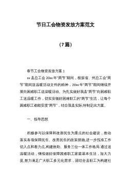 节日工会物资发放方案范文(7篇) 春节工会物资发放方案1 xx县总工会20xx年“两节”期间,根据省、州总工会“两节”期间送温暖活动文件的精神,20xx年“两节”期间继续开展向困难职工送温暖活动。为扎实做好我县“两节”向困难职工送温暖工作,切实安顿好困难职工的“两节”生活,让每个困难职工都能安度“两节”,结合我县实际,特制定此方案。 一、指导思想 积极参与以保障和改善民生为重点的社会建设,推动落实各项保障民生、改善民生的政策措施,进一步找准工作切入点和着力点,构建救助、服务三位一体工作格局.通过送温暖活动,继续做好保障困难职工家庭基本生活,加大力度,努力满足广大职工多元化需求,团结全县...