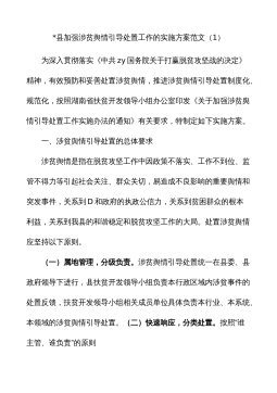 *县加强涉贫舆情引导处置工作的实施方案范文(1)为深入贯彻落实《中共zy国务院关于打赢脱贫攻坚战的决定》精神,有效预防和妥善处置涉贫舆情,推进涉贫舆情引导处置制度化、规范化,按照湖南省扶贫开发领导小组办公室印发《关于加强涉贫舆情引导处置工作实施办法的通知》有关要求,特制定如下实施方案。一、涉贫舆情引导处置的总体要求涉贫舆情是指在脱贫攻坚工作中因政策不落实、工作不到位、监管不得力等引起社会关注、群众关切,易造成不良影响的重要舆情和突发事件,关系到D和政府的执政公信力,关系到贫困群众的根本利益,关系到我县的和谐稳定和脱贫攻坚工作的大局。处置涉贫舆情应坚持以下原则。(一)属地管理,分级负责。涉贫舆情...