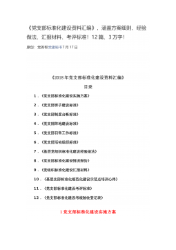 《党支部标准化建设资料汇编》,涵盖方案细则、经验做法、汇报材料、考评标准!12篇、3万字!原创:)党务帮)党建秘书)7月17日《2018年党支部标准化建设资料汇编》目录1.《党支部标准化建设实施方案》2.《党支部班子建设标准》3.《党支部制度台帐标准》4.《党支部阵地建设标准》5.《党支部日常工作标准》6.《党支部活动组织标准》7.《基层党组织标准化建设经验做法》8.《党支部标准化建设情况报告》9.《党组织标准化建设汇报材料》10.《基层支部标准化规范化建设示范点培训心得》11.《党支部标准化建设考评标准》12.《党支部标准化建设考核验收登记表》1党支部标准化建设实施方案为贯彻落实全面从...