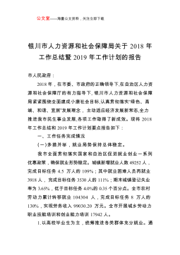 公文堂——海量公文资料,关注立即下载银川市人力资源和社会保障局关于2018年工作总结暨2019年工作计划的报告市人民政府:2018年,在市委、市政府的正确领导下,在自治区人力资源和社会保障厅的有力指导下,银川市人力资源和社会保障局紧紧围绕全面建成小康社会目标,认真贯彻落实“绿色、高端、和谐、宜居”发展理念,主动适应经济发展新常态,全力推进我市民生事业发展,各项工作取得了新成效。现将2018年工作总结和2019年工作计划要点报告如下:一、工作任务完成情况(一)多措并举,就业局势保持总体稳定。我市全面贯彻落实国家和自治区促进就业创业一系列优惠政策,确保就业形势稳定。城镇新增就业人数49252人,完...
