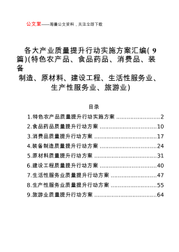 各大产业质量提升行动实施方案汇编(9篇)(特色农产品、食品药品、消费品、装备制造、原材料、建设工程、生活性服务业、生产性服务业、旅游业)