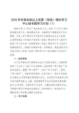 2025年市县处级以上党委(党组)理论学习中心组专题学习计划(1)2025年是“十四五”规划收官之年,也是“十五五”规划的谋篇布局之年,推进理论武装、加强领导干部理论学习至关重要。为深入学习贯彻习近平新时代中国特色社会主义思想,认真贯彻落实《中国共产党党委(党组)理论学习中心组学习规则》和《关于进一步提高党委(党组)理论学习中心组学习质量的意见》,根据中央精神和省、市委要求,现就2025年全市县处级以上党委(党组)理论学习中心组专题学习作出如下安排。一、指导思想以习近平新时代中国特色社会主义思想为指引,全面贯彻党的二十大和二十届三中全会精神,深刻领悟“两个确立”的决定性意义,增强“四个意识”、...