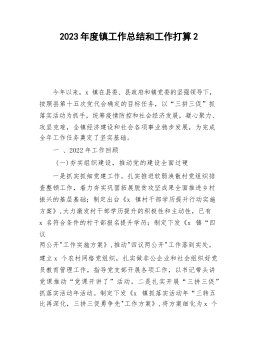 2023年度镇工作总结和工作打算2今年以来,x镇在县委、县政府和镇党委的坚强领导下,按照县第十五次党代会确定的目标任务,以“三拼三促”抓落实活动为抓手,统筹疫情防控和社会经济发展,凝心聚力、攻坚克难,全镇经济建设和社会各项事业稳步发展,为完成全年工作任务奠定了坚实基础。一、2022年工作回顾(一)夯实组织建设,推动党的建设全面过硬一是抓实抓细党建工作。扎实推进软弱涣散村党组织排查整顿工作,着力夯实巩固拓展脱贫攻坚成果全面推进乡村振兴的基层基础;制定出台《x镇村干部学历提升行动实施方案》,大力激发村干部学历提升的积极性和主动性,已有x名符合条件的村干部报名提升学历;制定下发《x镇“四议两公开"工...