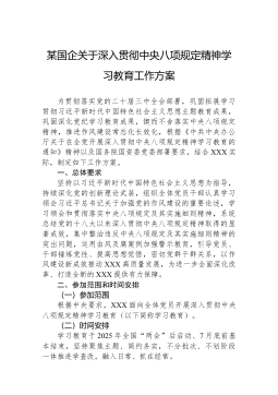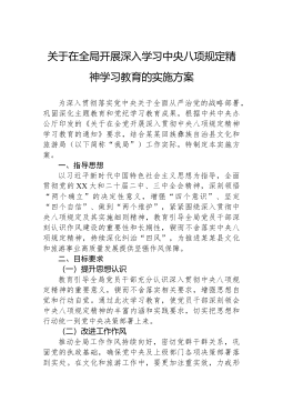 关于在全局开展深入学习中央八项规定精神学习教育的实施方案为深入贯彻落实党中央关于全面从严治党的战略部署,巩固深化主题教育和党纪学习教育成果,根据中共中央办公厅印发的《关于在全党开展深入贯彻中央八项规定精神学习教育的通知》要求,结合某某回族彝族自治县文化和旅游局(以下简称“我局”)工作实际,特制定本实施方案。一、指导思想以习近平新时代中国特色社会主义思想为指导,全面贯彻党的XX大和二十届二中、三中全会精神,深刻领悟“两个确立”的决定性意义,增强“四个意识”、坚定“四个自信”、做到“两个维护”,紧紧围绕深入贯彻中央八项规定及其实施细则精神,教育引导全局党员干部深刻认识作风建设的重要性和长期性,锲而不舍落实中央八项规定精神,持续深化纠治“四风”,为推进某某县文化和旅游事业高质量发展提供坚强作风保障...