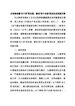 水利局创建“五个好”党支部、建设“四个合格”党员队伍实施方案为认真贯彻落实X总书记视察新疆重要讲话和重要指示精神,深入贯彻《中国共产党支部工作条例(试行)》,落实《关于健全党建引领基层治理工作体系的指导意见》(新党办发〔2022〕14号)部署,推动把各基层党组织建设成为坚强战斗堡垒,凝聚建设美好新疆的强大力量,不断巩固党在新疆的执政基础,结合实际,现就在自治州水利局各级党组织和党员中创建“五个好”党支部、建设“四个合格”党员队伍,制定如下实施方案。一、指导思想坚持以X新时代中国特色社会主义思想为指导,认真贯彻新时代党的建设总要求和新时代党的组织路线,完整准确贯彻新时代党的治疆方略,牢牢扭住社会...