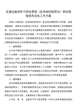 交通运输局学习宣传贯彻《反有组织犯罪法》和扫黑除恶常态化工作方案全国人大制定的《反有组织犯罪法》是总结扫黑除恶工作经验,加强制度建设,保障在法治轨道上常态化、机制化开展扫黑除恶工作的重要举措,为认真贯彻落实习近平总书记重要指示精神和中央、省市县委关于扫黑除恶常态化工作相关文件精神,学习宣传贯彻《反有组织犯罪法》、充分动员各方积极参与,为扫黑除恶常态化工作奠定坚实的群众基础,营造扫黑除恶常态化工作浓厚的舆论氛围,特制定如下工作方案。一、指导思想以习近平新时代中国特色社会主义思想为指导,全面学习贯彻落实党的二十大精神,认真落实习近平总书记重要指示精神,集中学习《反有组织犯罪法》总则、国家工作人员涉...