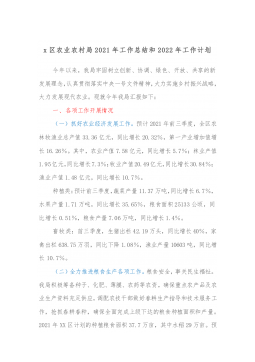 ·1县农业农村局2021年工作总结及2022年工作计划今年以来,在县委、县政府的坚强领导下,县农业农村局深入学习贯彻落实中、省、市农村工作会议精神,加快农业产业结构调整,壮大经营主体,发展现代农业园区,完善服务体系,农业农村经济总体呈现产量稳定、质量向好、改革深入、农民收入稳定增长的平稳态势。一、2021年主要工作开展情况(一)加快产业结构调整。一是稳定粮食播种面积。深入实施“藏粮于地、藏粮于技”战略,积极应对新冠肺炎疫情,防控小麦赤霉病、草地贪夜蛾等病虫害,小麦种植面积X万亩,总产X万吨,较上年增产X%;玉米种植面积X万亩,总产X万吨,较上年增产X%。二是加快发展特色产业。存栏生猪X万头、肉...