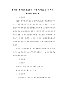 图书馆“百年荣光薪火相传”中国共产党成立100周年有奖知识策划方案一、活动形式2021年是中国共产党成立100周年,也是十四五开局之年和两个一百年历史交汇的关键节点。为深入学习贯彻习近平总书记在党史学习教育动员大会上的重要讲话精神,在中国共产党百年诞辰来临之际,博看网联合全国图书馆举办百年荣光薪火相传有奖知识竞答,引导广大读者学史明理、学史增信、学史崇德、学史力行,学党史、悟思想、办实事、开新局,以昂扬姿态奋力开启全面建设社会主义现代化国家新征程,以优异成绩迎接建党一百周年。读者进入活动专题页面,重温党的百年历程大事件后,即可点亮红包答题活动入口,按提示进入答题环节,完成高分挑战后,有机会抽取...