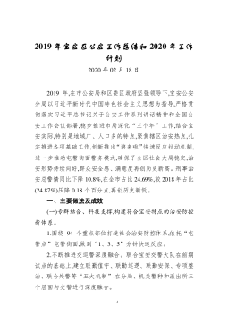 ·12019年宝安区公安工作总结和2020年工作计划2020年02月18日2019年,在市公安局和区委区政府坚强领导下,宝安公安分局以习近平新时代中国特色社会主义思想为指导,严格贯彻落实习近平总书记关于公安工作系列讲话精神和全国公安工作会议部署,稳步推进市局深化“三个年”工作,结合宝安实际,特别是地域广、人口多的特点,聚焦辖区治安热点,扎实推进各项基础工作,创新推出“狼来啦”快速反应拉动机制,进一步推动屯警街面警务模式,确保了全区社会大局稳定,治安形势持续向好,群众安全感、满意度再创历史新高。刑事治安总警情同比下降10.8%,在全市占比24.69%,较2018年占比(24.87%)压降0.18...