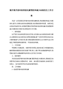 镇开展矛盾纠纷排查化解预防和减少命案发生工作方案为进一步完善落实矛盾纠纷排查化解机制,有效预防和减少命案发生,提升人民群众的安全感满意度,结合我镇实际经党委、政府决定,从现在开始到年末,在我镇范围内开展矛盾纠纷排查化解,有效预防和减少命案发生专项行动,特制定本工作方案。一、指导思想以严厉打击各种犯罪活动为手段,以完善社会治安防控体系为重点,全面落实社会治安综合治理各项措施,最广泛地号召和动员全社会力量积极参与,齐抓共管,最大限度遏制命案发生,全力维护社会大局稳定,不断巩固和发展和谐、平安的良好局面。二、工作目标牢固树立“命案必防、命案可防”的理念,抓好各项工作措施的落实,确保我镇命案防控实现“...