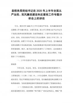 县税务局党组书记在2025年上半年全面从严治党、党风廉政建设和反腐败工作专题分析会上的讲话今天,我们召开2025年上半年全面从严治党、党风廉政建设和反腐败工作专题分析会,主要任务是:深入学习贯彻习近平总书记关于党的自我革命的重要思想,全面贯彻落实二十届中央纪委四次全会、总局、省局、市局全面从严治党工作会议精神,总结上半年工作,分析当前形势,部署下半年任务,推动我局全面从严治党、党风廉政建设和反腐败斗争向纵深发展,为高质量推进中国式现代化税务实践提供坚强保障。刚才,XX同志代表局党委作了工作报告,总结成绩全面客观,分析问题深刻到位,部署任务重点突出,我完全赞同。下面,我讲三个方面意见。一、上半年全面从严治党、党风廉政建设和反腐败工作取得新成效今年以来,在总局、省局、市局党委和县委的坚强领导下,...
