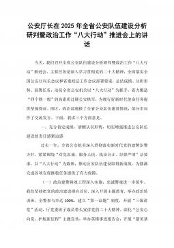 公安厅长在2025年全省公安队伍建设分析研判暨政治工作“八大行动”推进会上的讲话今天,我们召开全省公安队伍建设分析研判暨政治工作“八大行动”推进会,主要任务是深入学习贯彻党的二十大精神,全面落实全国公安厅局长会议和省委政法工作会议部署要求,总结成绩、分析形势、部署任务,动员全省公安机关以“八大行动”为抓手,着力锻造“四个铁一般”的高素质过硬公安铁军,为履行好新时代使命任务提供坚强保证。刚才,政治部通报了全省公安队伍建设情况,部分市局作了交流发言。下面,我讲三个方面意见。一、充分肯定成绩,清醒认识形势,切实增强推进公安队伍建设的责任感紧迫感过去一年,全省公安机关深入贯彻落实新时代党的建警治警方针,紧紧围绕“对党忠诚、服务人民、执法公正、纪律严明”总要求,以“八大行动”为载体,推动公安队伍建设取...