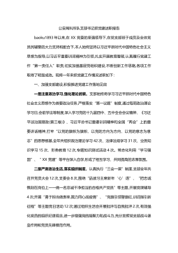 公安局科所队支部书记抓党建述职报告baoku1893年以来,在XX党委的坚强领导下,在党支部班于成员及全体党员民辅警的大力支持和配合下,本人始终坚持以习近平新时代中国特色社会主义思想为指导,以习近平重要训词精神为引领,扎实开展教育整顿,认真履行党建工作“第一责任人”职责,切实加强基层党组织建设,不断创新工作思路,各项工作取得了明显成效。现将一年来抓党建工作情况述职如下:一、加强支部建设,积极推进党建工作落地见效一是注重政治学习,强化理论武装。支部始终将学习习近平新时代中国特色社会主义思想作为首要政治任务,严格落实“第一议题”制度,通过每周政治理论学习日,会前学法等制度,深入学习党的十九届四中、...