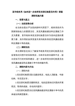 某市税务局《如何进一步发挥党支部纪检委员作用》课题调研实施方案一、背景与意义(一)当前形势分析在当前全面从严治党的新时代背景下,税务系统作为国家财政收入的重要支柱,其党风廉政建设和反腐败工作尤为重要。某市税务局党支部纪检委员作为党内监督的重要力量,其作用的发挥直接关系到税务系统党风廉政建设和反腐败斗争的成效。(二)调研目的本次调研旨在深入了解某市税务局党支部纪检委员在监督执纪问责中的实际情况,分析存在的问题和不足,提出切实可行的对策和建议,进一步发挥党支部纪检委员在党风廉政建设和反腐败斗争中的积极作用。二、调研内容与方法(一)调研内容1.党支部纪检委员队伍建设情况,包括人员配备、年龄结构、学历...