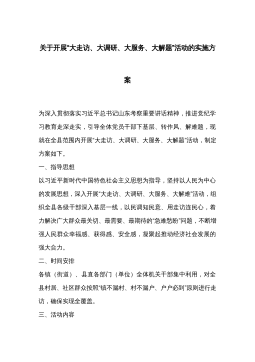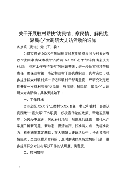 1关于开展驻村帮扶“访民情、察民情、解民忧、聚民心”大调研大走访活动的通知各乡镇(街道)党(工)委:为切实抓好20XX年巩固拓展脱贫攻坚成果同乡村振兴有效衔接国家省级考核评估反馈“XX市驻村干部综合满意度为86.8%,驻村工作有待加强”的问题整改,进一步压实驻村帮扶责任,确保驻村第一书记和驻村干部真蹲实驻、真帮实扶,稳步提升群众对驻村第一书记和驻村干部满意度,经研究决定近期开展一次驻村帮扶“访民情、察民情、解民忧、聚民心”大调研大走访活动,具体安排如下:一、工作目标全市全区XXX个“五类村”XXX名第一书记和驻村干部要认真围绕“一宣六帮”工作职责,积极宣传党的政策、帮建基层组织、为民办事服务、...