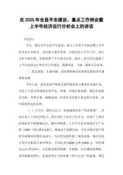 在2025年全县平安建设、重点工作例会暨上半年经济运行分析会上的讲话同志们:今天,我们召开全县平安建设、重点工作第7次例会暨上半年经济运行分析会。会议的主要任务是,全面总结上半年工作,深入分析当前形势,安排部署下半年重点任务。刚才,相关同志通报了上半年经济运行和有关工作情况,我都同意。下面,我讲几点意见。一、肯定成绩,正视问题,切实增强推动高质量发展的责任感和紧迫感今年以来,面对复杂严峻的宏观环境和艰巨繁重的发展任务,全县上下坚决贯彻落实党中央、省委、州委决策部署,锚定年初既定目标,攻坚克难、砥砺奋进,经济社会发展呈现出稳中有进、进中提质的良好态势。(一)上半年,我们交出了一份稳健增长的“经济答卷”。经过全县上下的共同努力,我们顶住了经济下行压力,实现了主要经济指标的平稳健康运行。据初步核算...
