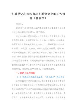2022年市纪委全会工作报告:以优异成绩迎接党的二十大胜利召开同志们:我代表中共xx市第九届纪律检查委员会常务委员会向第二次全体会议作工作报告,请予审议。这次全会的主要任务是:以习近平新时代中国特色社会主义思想为指导,全面贯彻党的十九大、十九届二中、三中、四中、五中、六中全会精神和习近平总书记视察xx重要讲话精神,认真贯彻十九届中央纪委六次全会、省纪委十四届二次全会和xx市纪委十一届二次全会工作部署,总结2021年纪检监察工作,部署2022年任务。刚才,xxx同志作了讲话,为进一步贯彻中央纪委、省纪委和xx市纪委全会精神,做好我市纪检监察工作提出了明确要求。我们要认真学习领会,坚决贯彻落实。一...