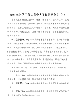 ·12021年社区工作人员个人工作总结范文(1)今年我主要负责住房保障、优抚、退役军人、征兵等工作,在过去的一年里在街道党工委和市区房管局、退役军人事务局等相关部门的领导下,在社区两委的关心和培养下,在社区广大党员群众的支持和共同努力下顺利的完成了上级下达的各项任务,下面我就负责的工作做简单总结:一、住房保障工作:今年共受理廉租房年审x件,其中x件为新申请,x件为年审,x件为公转廉,x件资格已确认,x件还在审核过程中;共受理公租房年审x件,其中x件为年审件,x件为廉转公,x件资格已确认,x件还在审核过程中;共受理租赁补贴x件,其中x件为新申请件,x件为年审件,x件资格已确认,x件还在审核过程中...