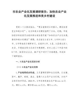 市农业产业化发展调研报告:加快农业产业化发展推进和美乡村建设党的二十大报告指出,“要全面推进乡村振兴,建设宜居宜业和美乡村”,这为和美乡村建设指明了方向。近期,市政协经济科技委员会组织部分政协委员就“加快农业产业化发展,推进和美乡村建设”课题,先后前往X省X市、X市和X省X市、X市等地进行调研学习,在我市X市、X县、X县通过深入走访、开展座谈等方式进行专题调研,并对上述三个市县中的9个村、30家农业企业、90户农户进行了问卷调查,形成如下调研报告。一、X农业产业化现状分析(一)X农业产业化优势1.产业格局初步形成。立足富硒资源和生态优势,以生猪、茶叶、魔芋、核桃、渔业、蚕桑六大主导产业为引领,...