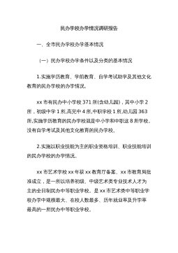 民办学校办学情况调研报告一、全市民办学校办学基本情况(一)民办学校办学条件以及分类的基本情况1.实施学历教育、学前教育、自学考试助学及其他文化教育的民办学校的办学情况。xx市有民办中小学校371所(含幼儿园),其中小学2所,初级中学1所,高完中4所,中职学校1所,幼儿园363所,实施学历教育的民办学校就是中小学和中职这8所学校。没有自学考试及其他文化教育的民办学校。2.实施以职业技能为主的职业资格培训、职业技能培训的民办学校的办学情况。xx市艺术学校xx年获xx教育厅备案、xx市教育局批准成立,是一所以培养初级、中级艺术类专业技术人才为主的全日制民办中等职业学校。是xx市艺术类中等职业学校办学...