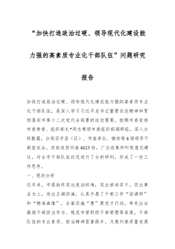 “加快打造政治过硬、领导现代化建设能力强的高素质专业化干部队伍”问题研究报告加快打造政治过硬、领导现代化建设能力强的高素质专业化干部队伍,是深入学习习近平总书记重要论述精神和贯彻落实市第十二次党代会部署的迫切需要。按照市委安排市委常委、组织部长*同志带领市委组织部调研组,深入分析数据,分别召开县(区)、市直单位、镇街等6场领导干部座谈会,发放收回问卷4217份,广泛收集和听取意见建议,对全市干部队伍状况进行了分析研判,形成了一些工作思考。一、现状分析近年来,市委始终突出政治标准,突出崇尚实干,突出事业为上,突出五湖四海,认真开展了干部工作“深调研”和“精准画像”,全面实施“惠”聚优才行动,率先...