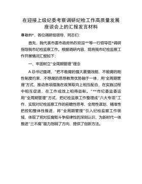在迎接上级纪委考察调研纪检工作高质量发展座谈会上的汇报发言材料尊敬的*,各位调研组领导,同志们:首先,我代表市委市政府热烈欢迎**等一行领导莅*调研指导我市纪检监察工作。根据调研内容,现将我市纪检监察工作开展情况汇报如下:“”一、牢固树立全周期管理理念A“总书记强调,把不敢腐的强大震慑效能、不能腐的刚‘性制度约束、不想腐的思想教育优势融于一体,用全周期管’理方式,推动各项措施在政策取向上相互配合、在实施过程”中相互促进、在工作成效上相得益彰。**市纪委监委运“”“”用全周期管理方式,把纪检监察工作整理成六大专项工作,实现对纪检监察工作的前瞻性思考、全局性谋划、精准性把控和整体性推进。“”将全周...