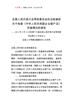 公文堂——海量公文资料,关注立即下载全国人民代表大会常务委员会执法检查组关于检查《中华人民共和国企业破产法》实施情况的报告——2021年8月18日在第十三届全国人民代表大会常务委员会第三十次会议上全国人大常委会副委员长王东明全国人民代表大会常务委员会:企业破产法是市场经济的一项基础性法律制度。为全面贯彻落实党的十九大和十九届二中、三中、四中、五中全会精神,科学把握新发展阶段,全面贯彻新发展理念,服务构建新发展格局,深化供给侧结构性改革,促进高质量发展,推动企业破产法有效实施,根据2021年度监督工作计划,全国人大常委会对《中华人民共和国企业破产法》的实施情况开展了检查。现将执法检查的主要情况报...