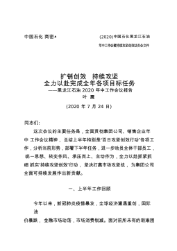 中国石化商密▲(2020)中国石化黑龙江石油年中工作会暨持续攻坚创效动员会文件扩销创效持续攻坚全力以赴完成全年各项目标任务——黑龙江石油2020年中工作会议报告叶震(2020年7月24日)同志们:这次会议的主要任务是,全面贯彻集团公司、销售企业年中工作会议精神,总结上半年特别是“百日攻坚创效行动”各项工作,分析当前形势,部署下半年任务,进一步动员全体干部员工,统一思想、转变作风、承压而上、主动作为,全力以赴抓紧抓细抓实“持续攻坚创效”行动,坚决打赢市场攻坚战,为集团公司全面可持续发展作出新贡献。一、上半年工作回顾今年以来,新冠肺炎疫情暴发,全球经济遭遇重创,国际油价暴跌,金融市场动荡,市场消费...