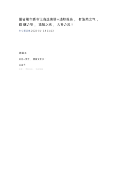 副省级市委书记当选演讲+述职报告,有浩然之气,磅礴之势,鸿鹄之志,古贤之风!办公室天地2022-01-1311:13老组工点击+关注,提拔又进步!公众号来源:贵阳发布,特此致谢!同志们:刚刚闭幕的中国共产党贵阳市第十一次代表大会,选举产生了中共贵阳市第十一届委员会和纪律检查委员会。刚才,市委十一届一次全会又选举产生了新一届市委常委会和书记、副书记,通过了市纪委十一届一次全会的选举结果。在此,我代表新一届市委常委会,对大家的信任和支持表示衷心的感谢!全会选举我继续担任市委书记,我深知,一张张选票,饱含的是各位委员、各位代表毫无保留的信任与支持,承载的是全市党员干部群众的厚望与重托,传递的是推动贵...